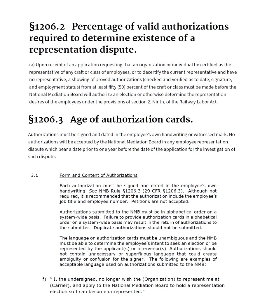 The Railway Labor Act guarantees employees the right to be represented by a representative of THEIR OWN CHOOSING. In 2019 the Rules for Railroad and Airline employees were revised and allow for employees to get free of a union they do not want by filing for an election with the National Mediation Board (NMB). 1. The first step is to get at least 50% of all the employees who work under the Union labor contract to sign what is known as an AUTHORIZATION CARD. a. Because sometimes workers are at several locations you may think that is imposable, but you can do it. Talk to a likeminded worker in another work facility of your company and ask WORKERS for help. Ask friendly WORKERS to get workers to sign cards for you. b. NEVER ASK ANYONE IN MANAGEMENT TO GIVE YOU HELP HAVING CARDS SIGNED. Only workers can ask other workers to sign cards. c. Cards must have the exact and proper wording on them so attached is a cad you can print on plan paper and that card has the proper wording on it so you will get it right. d. You have about a year to get enough signed cards so there is no rush, but you should get them all as soon as you can. Once you have 50% of the employees to sign cards you go to step 2 below. e. For a vote application to work, you must have over one half of all the employee fill out and sign the authorization cards. i. This means that if there are 100 employees in the union (100 workers) then at least 51 workers must sign a card before you go to step 2. People who sign do not have to be members of the union, but they only need to be paid under the contract or be part of a "unit". ii. If there are 10 workers, then at least 6 workers must sign cards before you go to step 2. iii. No worker should fill out and sign more than one card. (One person - one vote). f. Obviously, the more workers that sign cards, the more forceful it is. So, you need to get as many signatures on cards from workers as you can. |